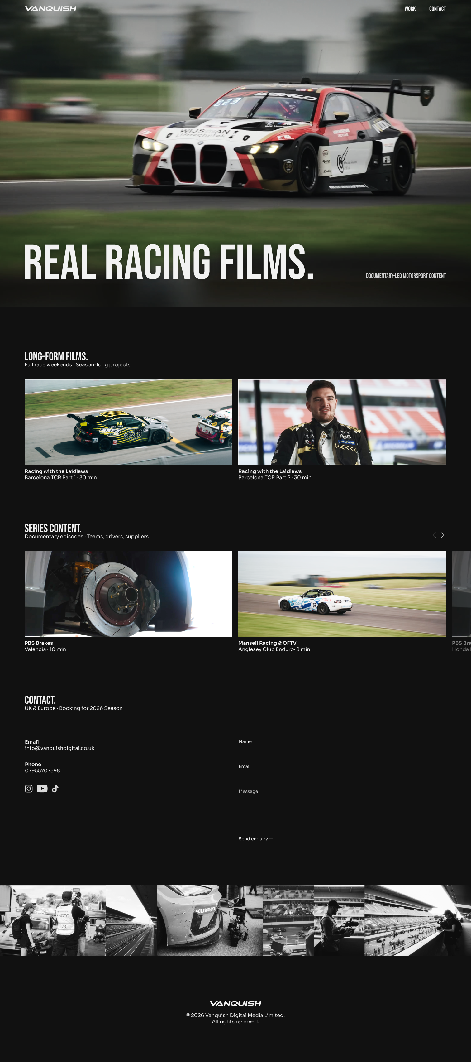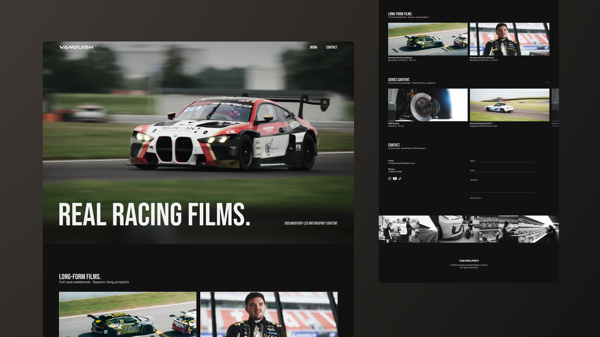 A single-page site built around long-form motorsport documentary production, using a dark, dark, restrained layout that gives the work space to stand on its own without over-explanation.
